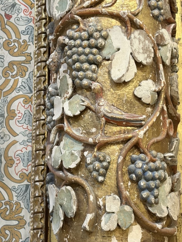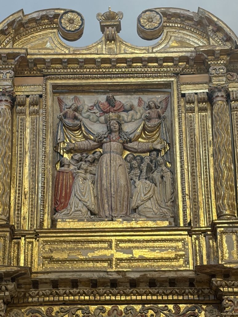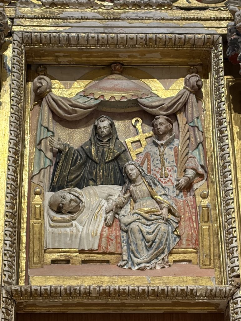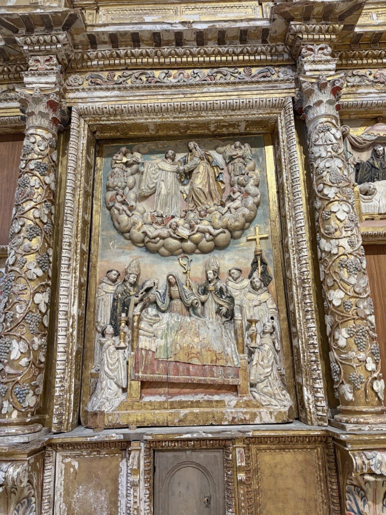 Curiosidad: Pese a la pérdida de algunas de las tablas laterales del retablo, se conserva la curiosa escena central, que representa el Tránsito de San Bernardo de Claraval, siendo acompañado por la Virgen y monjes cistercienses. En la parte superior se recrea la Ascensión a los cielos del santo acompañado por María rodeados de un círculo de ángeles y querubines siendo este un recurso frecuente dentro del barroco.